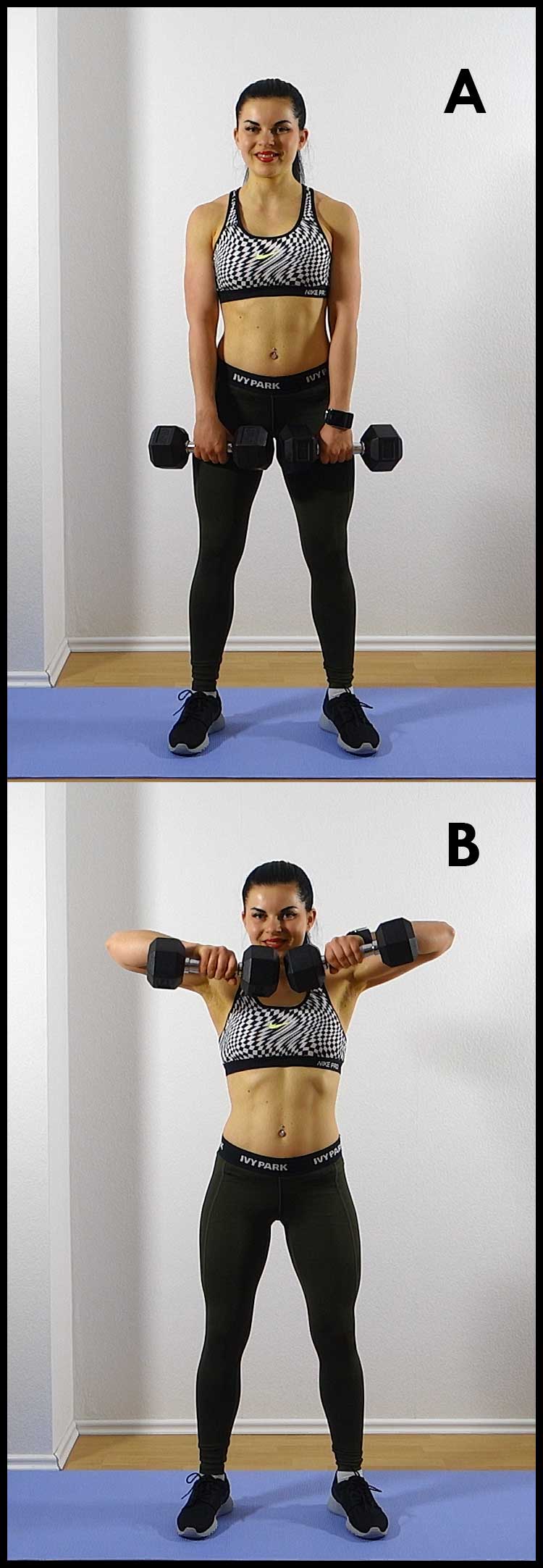 - Stand shoulder-width apart as demonstrated in position A, holding both dumbbells right below your pelvic area.
